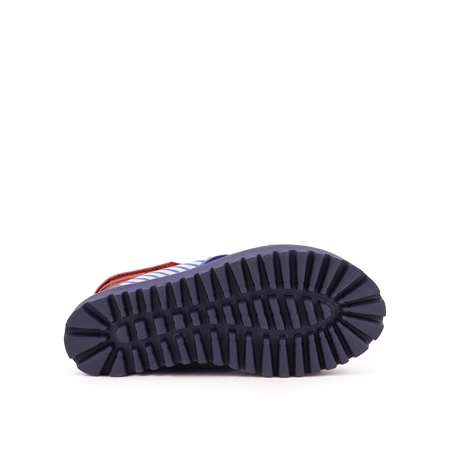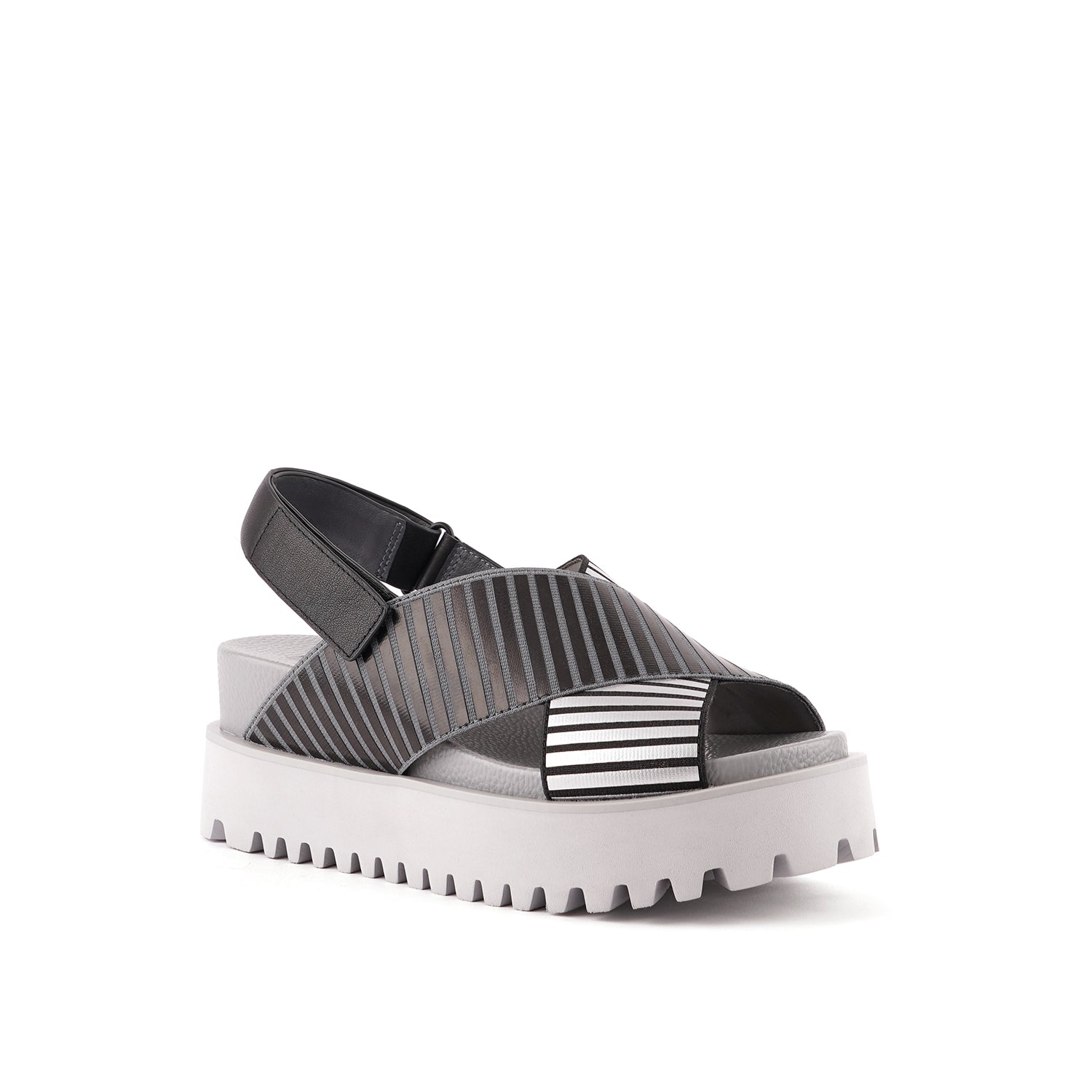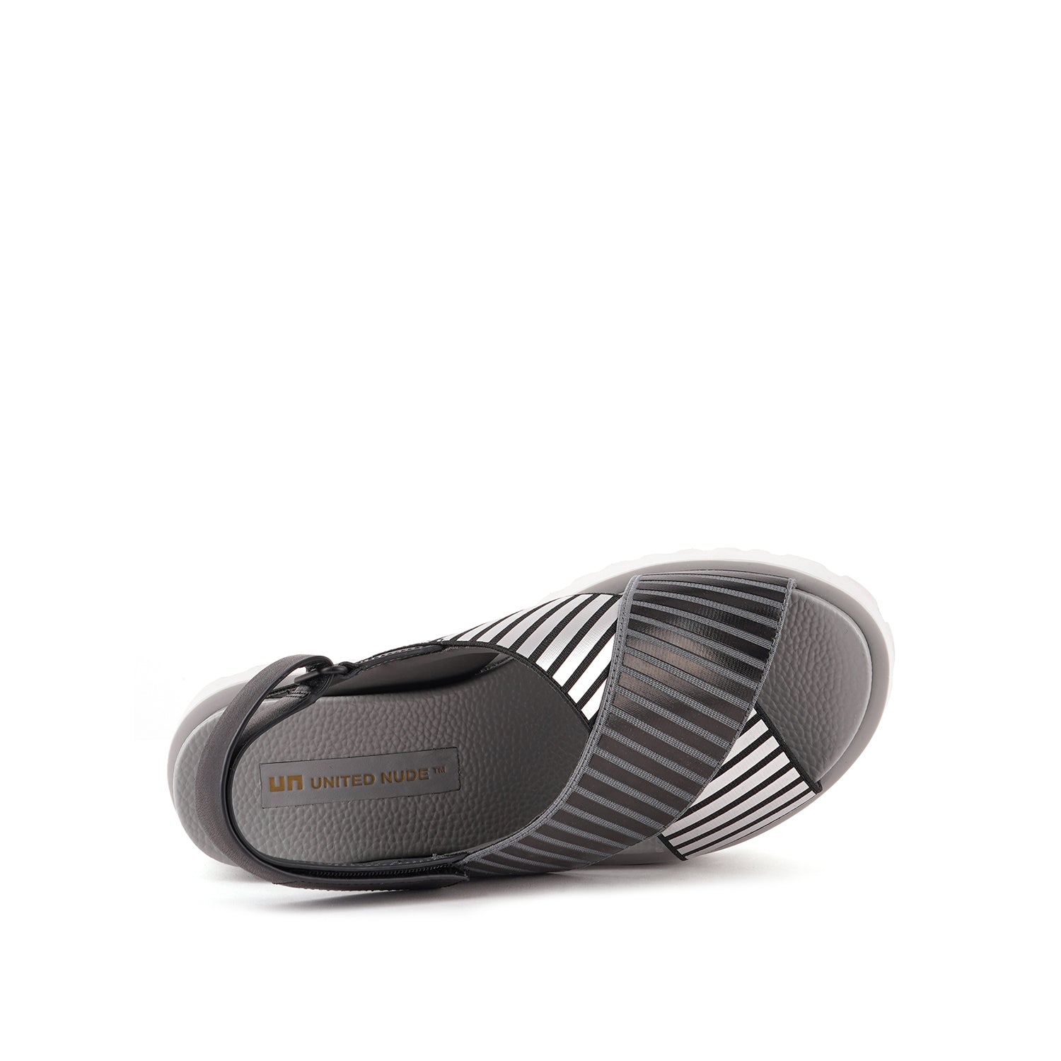 The Rico X Sandal pairs United Nude's signature silicon-printed elastics with a cross-strap upper and adjustable back strap for secure, customizable support. Built on a lightweight EVA outsole, the exposed leather-wrapped wedge delivers a gentle lift. A refined flatform engineered for comfort and style.
