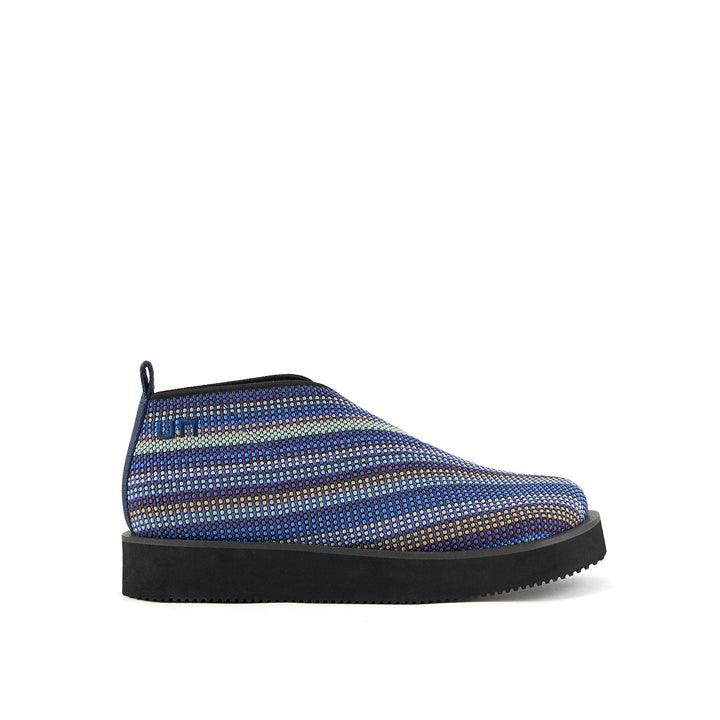 United Nude's celebrated Fold collection returns this season in new textiles, maintaining its iconic Fold Design – a single-piece upper made from custom-designed woven elastics that wraps around the foot like a scarf. The Fold Lo is a slip-on style featuring a low-profile silhouette and a cleated, foam rubber flatform sole. It offers effortless comfort for everyday wear with a touch of modern flair.
