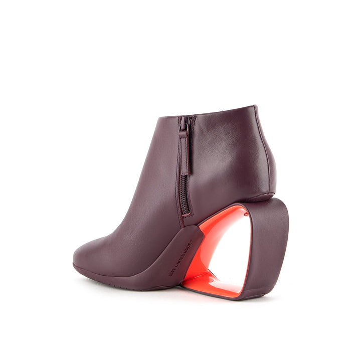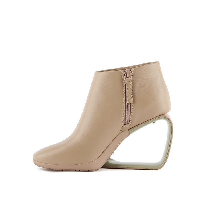 The Mobius Ankle Bootie Hi showcases the brand's signature architectural approach to footwear design. This sleek ankle boot features a minimalist leather upper that allows its innovative heel to take center stage. The Mobius heel, a continuous, ribbon-like structure that seamlessly wraps around the back of the foot, creates a captivating and gravity-defying visual. A side zipper ensures easy on and off, while the smooth lines of the boot maintain a sophisticated aesthetic.