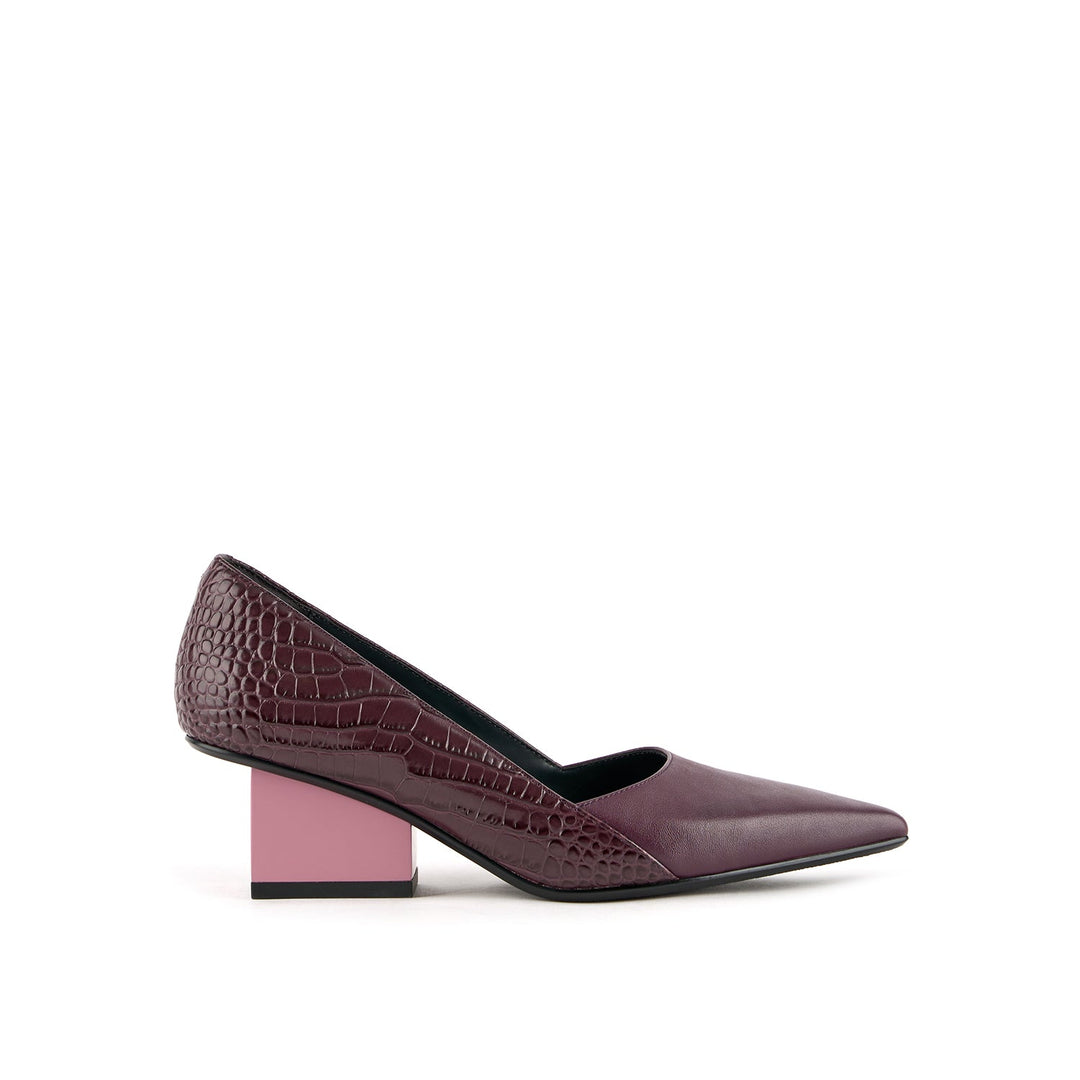 The Raila Pump offers a sophisticated and modern take on a classic silhouette. Featuring a sleek, pointed toe and a refined leather upper crafted in polished leathers and metallics, the Raila maintains an elegant profile. The defining feature is the geometric block heel, which provides stability and adds contemporary edge.